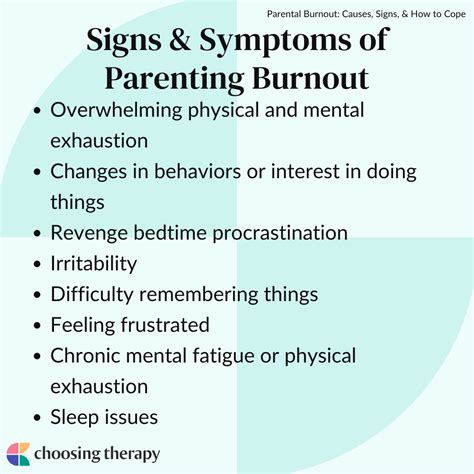 - Signs and symptoms of parenting burnout: Some common signs of parenting burnout are feelings of exhaustion, irritability, lack of motivation, increased anxiety or depression, neglecting self-care, and a decrease in overall satisfaction and enjoyment in parenting.